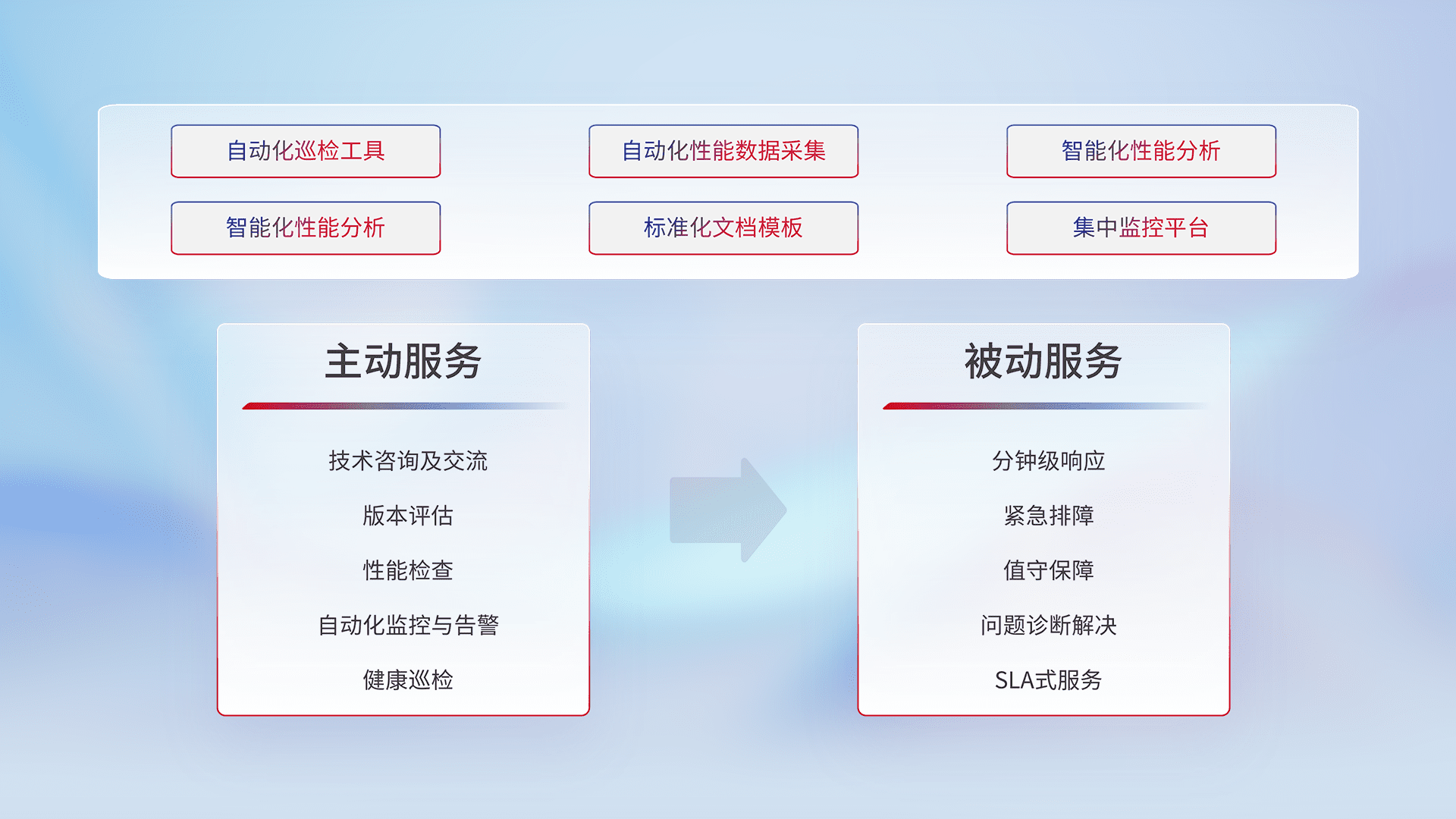 智能化工具和标准化文档,,保障服务质量,,,提供主动服务(包含技术咨询、、、版本评估、、、、性能检查、、、自动化监控与告警、、、健康巡检)和被动服务包含(分钟级响应、、、紧急排障、、、值守保障、、、、问题诊断解决、、、SLA服务)。。。。