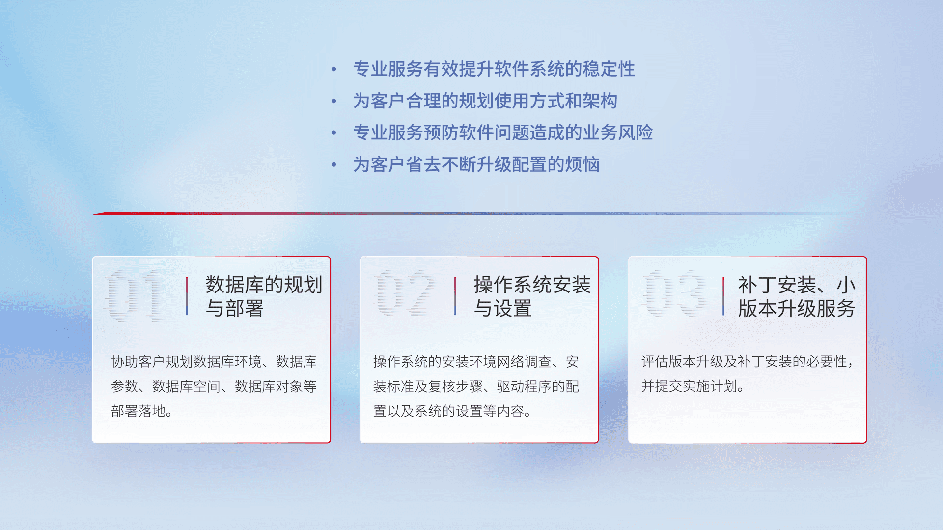 为客户提供软件规模升级、、、快速部署、、、、按需配置的专业服务,,,从数据库的规划与部署到操作系统的安装与设置,,再到补丁安装和小版本升级提供支持。。